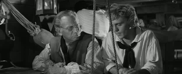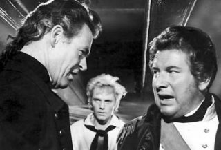 It was odd that Claggart was played by an American (Robert Ryan). (I had to keep telling myself he must have been impressed from a U.S. ship, though that might be an historical stretch.) However, he came across fairly convincing as Billy’s self-appointed nemesis. Ustinov was excellent as Vere, encompassing the captain’s nervousness, sense of justice, and pervading paranoia/wish to exert authority…amazing he was able to portray Vere so accurately (maybe the two hours are partly to thank).