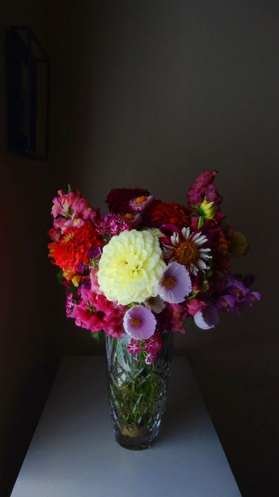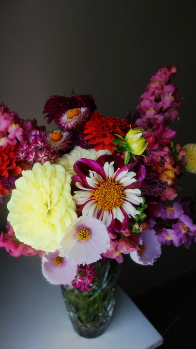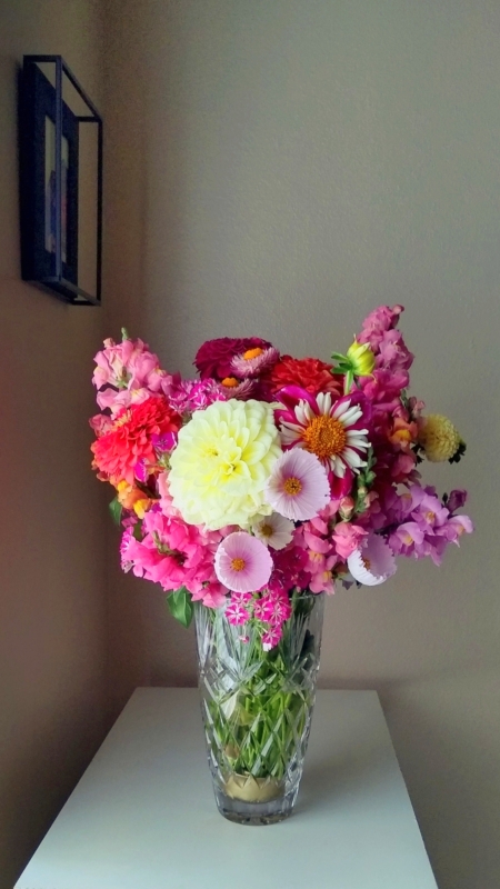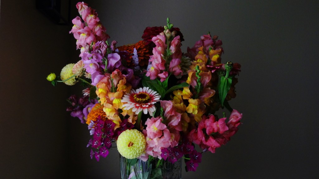 My sister Emily made this from dahlias she grew herself, snapdragons, and other flowers from our mom’s garden. Isn’t it spectacular?! It’s her first large-scale arrangement, too! 😮