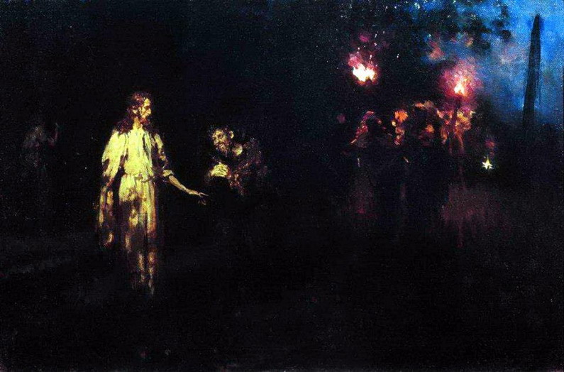 The next three are by Ilya Repin (1844–1930). His realism is good, but I find his impressionism even better. The lack of clarity is unsettling, which couldn’t be more apt for describing the temptation in the wilderness or the betrayal in the garden.