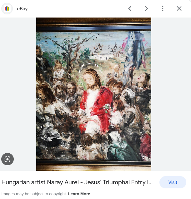 Last but not least, this is Jesus’ Triumphal Entry by Naray Aurel. I know nothing about this artist and don’t even remember how I stumbled upon it… I could not find it anywhere except a picture on eBay. I wish very much I could get a print of this, because I feel it conveys the bittersweetness of Palm Sunday that is missing in other paintings—the crowd believes Jesus is going to start a revolt against the Romans, but He knows He is riding towards a cruel and humiliating death.